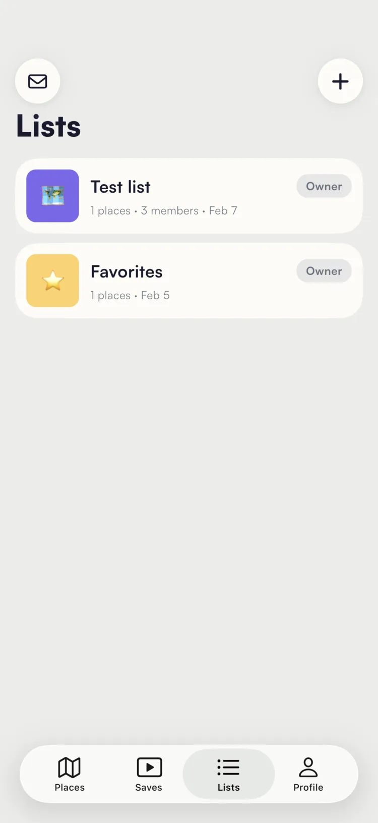 Navigate to the Lists tab to see all lists you own or have been invited to. Each list shows its icon, title, how many places it contains, member count, and when it was last updated.